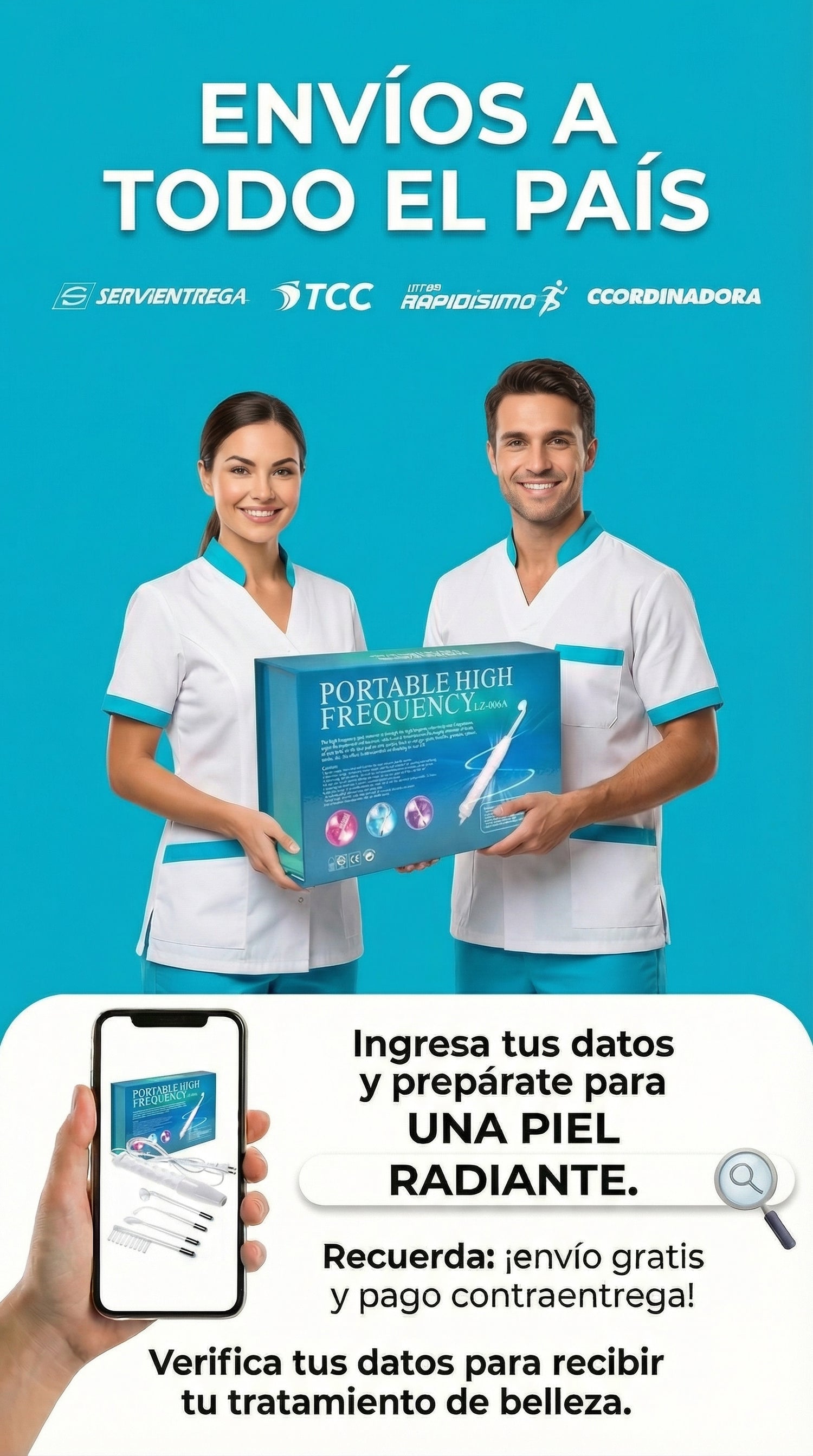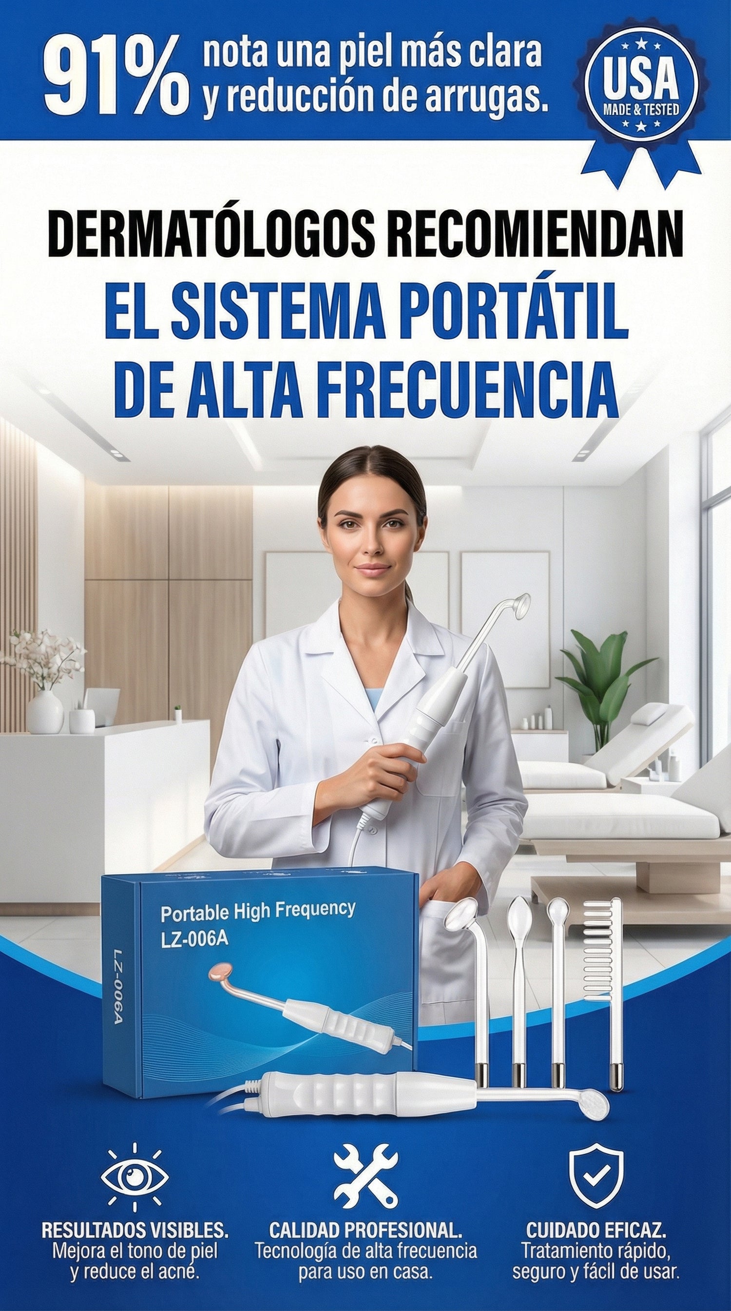 La Alta Frecuencia Portátil LZ-006A es un equipo estético diseñado para trabajar la piel mediante ondas de alta frecuencia que oxigenan, desinflaman, desinfectan y revitalizan.